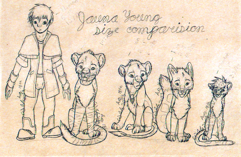 This is literally a sketch of Juanra's forms, showing the size compared to the other.Art//Juanra//[c] 1Timestones 2013--Human--Weight: 127 lbsHeight: 5' 7"--Sabered Tiger--Weight: 172 lbsHeight: 3' 9"--Lion--Weight: 144 lbsHeight: 3' 2"--Fox--Weight: 64 lbsHeight: 2' 10"--Cheetah--Weight: 43 lbsHeight: 2' 4"