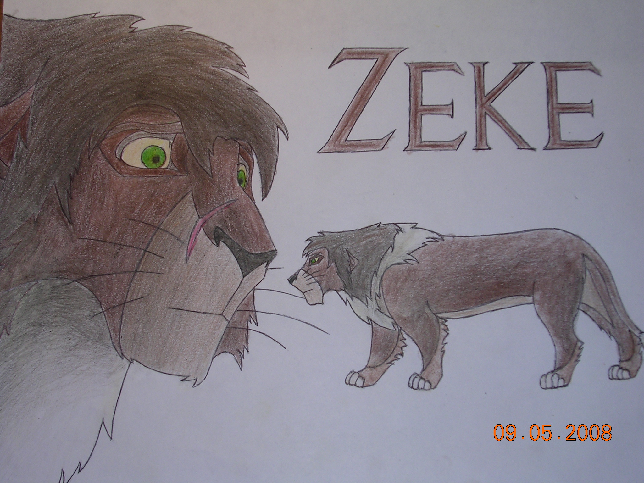 Info: Zeke was a member of a small, but close pride growing up. Being at such low numbers, his pride relied on smarts more than brute strength. Unable to outsmart the Zeke's pride, a rival pride set fire to the grasslands surrounding it. Being surrounded by flame, Zeke dashed through, suffering burns that later altered the color of his fur to white. Zeke slipped away and watched helplessly as his friends suffocated or burned. Traumatized by the horrible scene, Zeke fled and wanders aimlessly, stealing scraps from prides he encounters, then moving on. As far as he knows, Zeke is the only survior of the grass fire.
