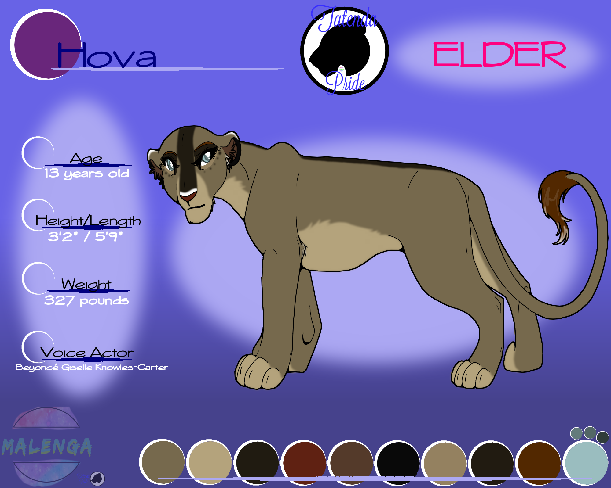 Personality Hova is a very accepting lioness, able to tolerate many lifestyles and others who do not suit her fancy as she might like. She has a knack for being able to read others, and give advice in the best way she can. As well as being caring and loving to all of those in her pride, she can find herself being a mother to more than just her cubs. As she was once belittled by her father, she has a tendancy to be stubborn and hide her emotions, only doing her best to show the very best, strong part of her for everyone to see. If she has someone who is disrespecting her, she likes to handle them with sarcasm and can find herself sometimes letting her own complex come out to belittle them. Very rarely does she use her Queen position to put others in her place, but sometime she can let it slip. Her temper can go from 0 to 1,000 if she's mad enough about a situation, so best watch out for that on this lioness. Other than that, she enjoys talking to her pride mates and helping others who need it.