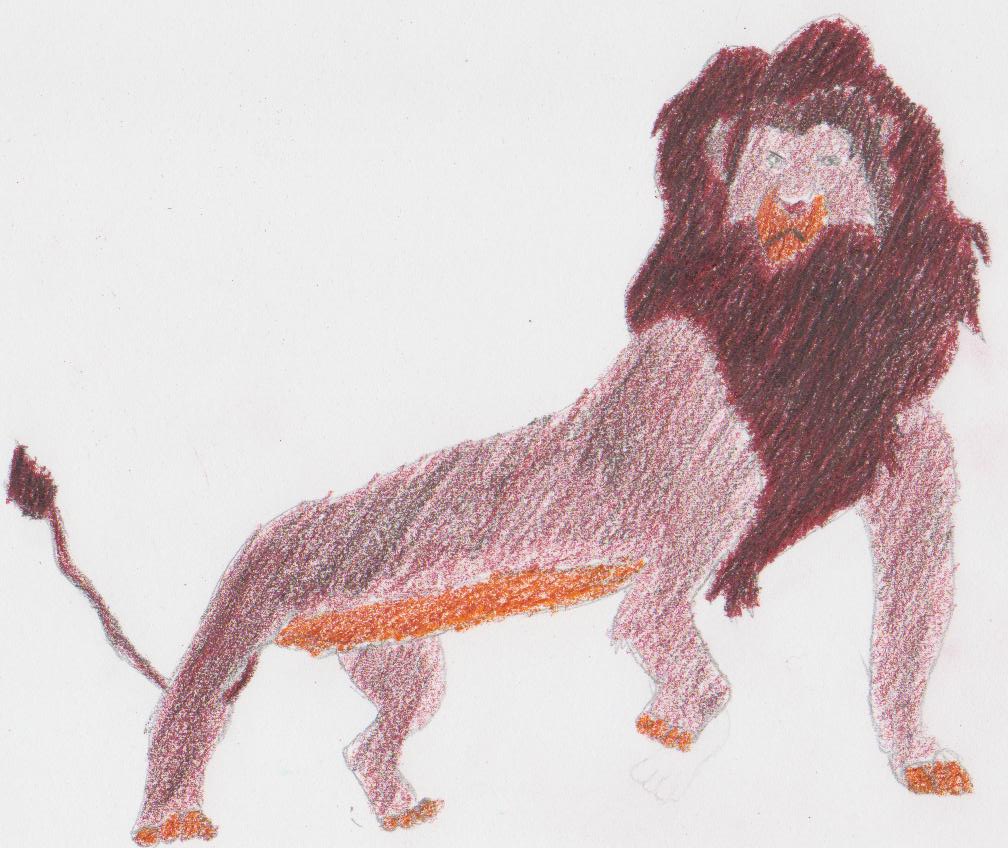 tamu has a fierce appearance, so other lions tend to avoid him. he has a red mane which is so dark it looks black. his body is a slightly lighter red than his mane, and his paws and underbelly are an orange color.