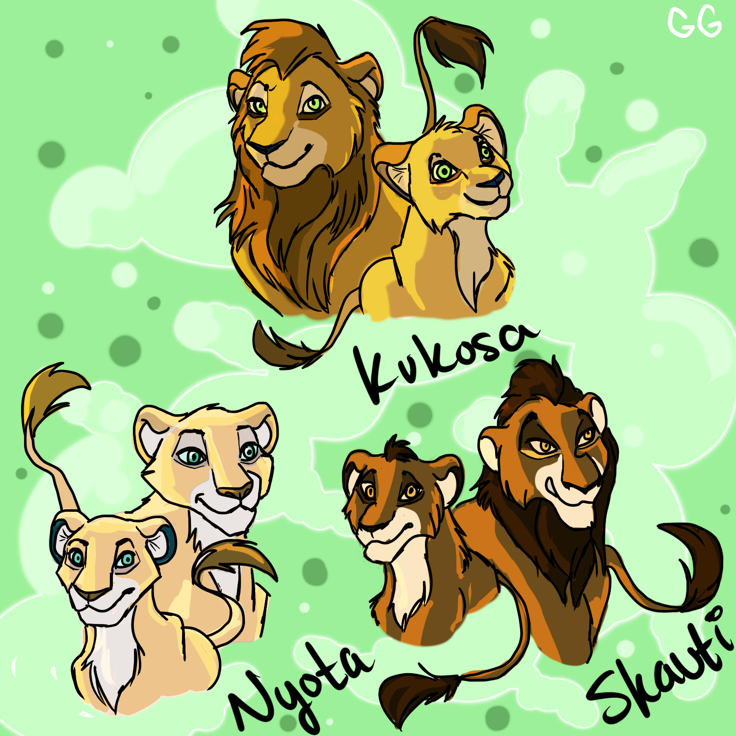 These are just quick sketches. The one on the top, Kukosa, is brother to the female. Skauti is just another OC that I've had for forever. I'll put info for each individually down below. I want Kukosa to be an adult, Nyota to be an older adolescent and Skauti to be a younger adolescent in this.
