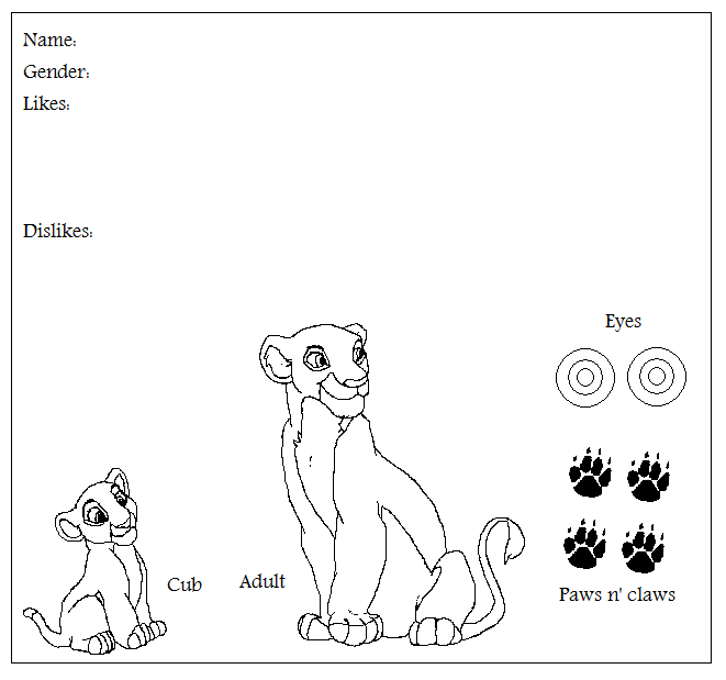 I'd include info like: A picture, likes, dislikes, accessories and other things like that! Maybe even a cub/teen/adult thing!