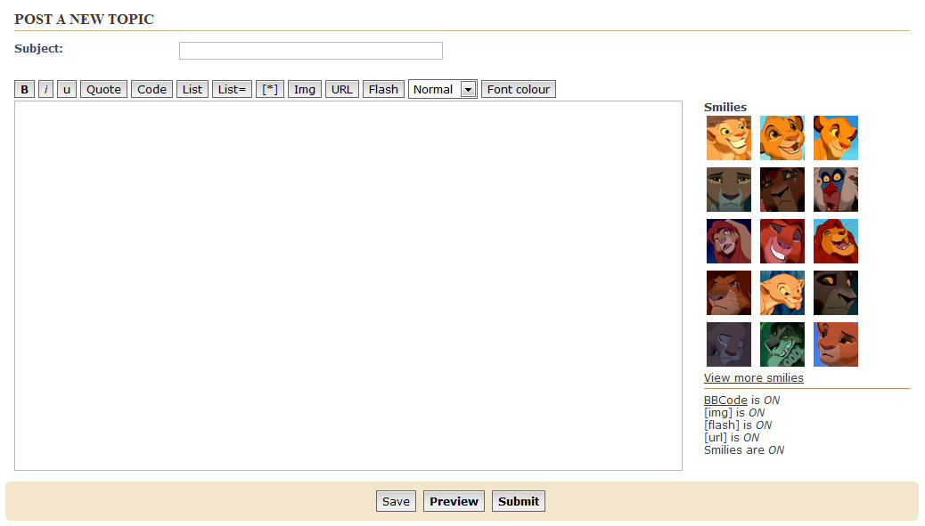 The new theme of My Lion King has a simplified but fully featured editor for creating and editing posts on the My Lion King Forum.
