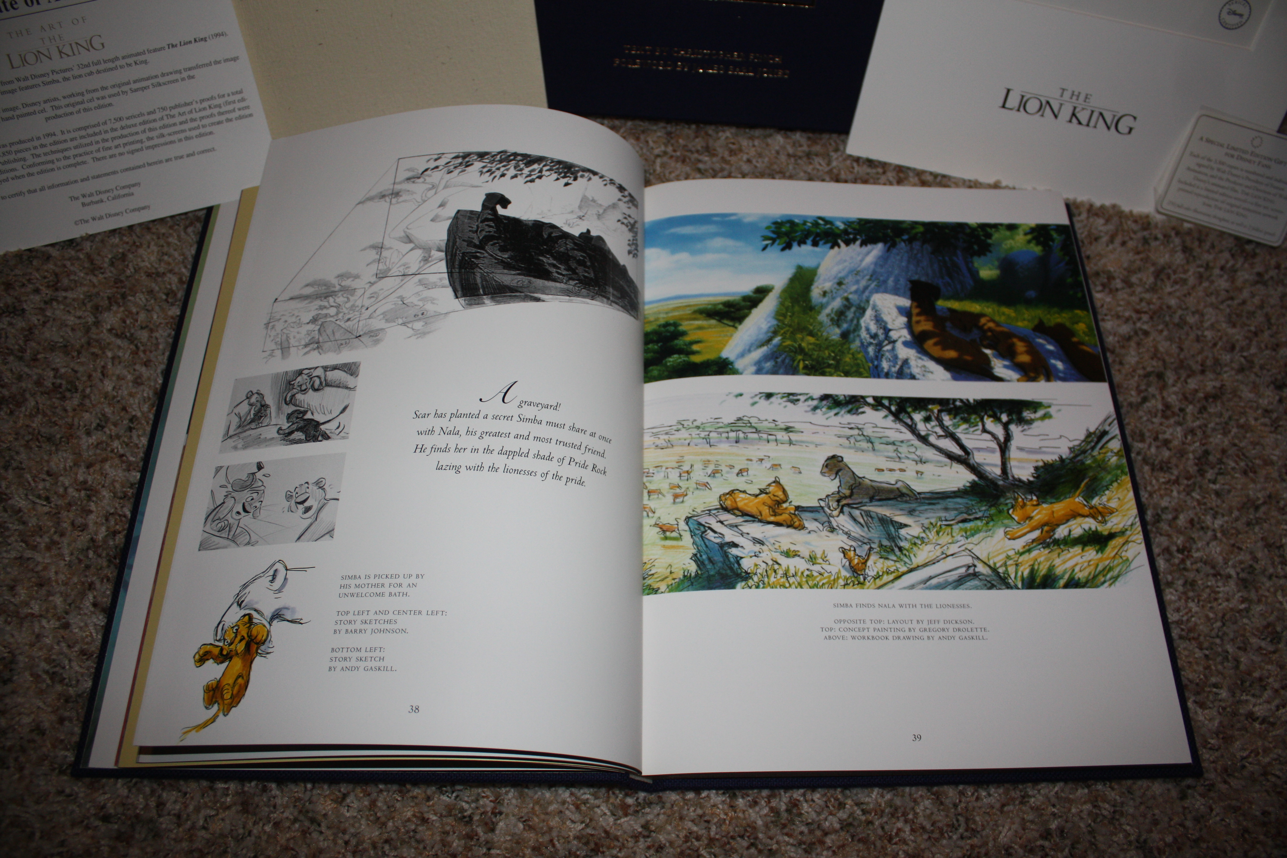 The first one is, without question, the pearl of my collection. I am one of the 3500 Lion King fans that own this epic 1st edition book, its the source of many concept/storyboard images that are on MLK. This cloth-bound book has been signed by Peter Schnieder, Don Hahn, Rob Minkoff & Roger Allers. It includes a sericel (fine art) screen-printed reproduction of original animation artwork (Simba from Just can't wait to be king). I give you...
