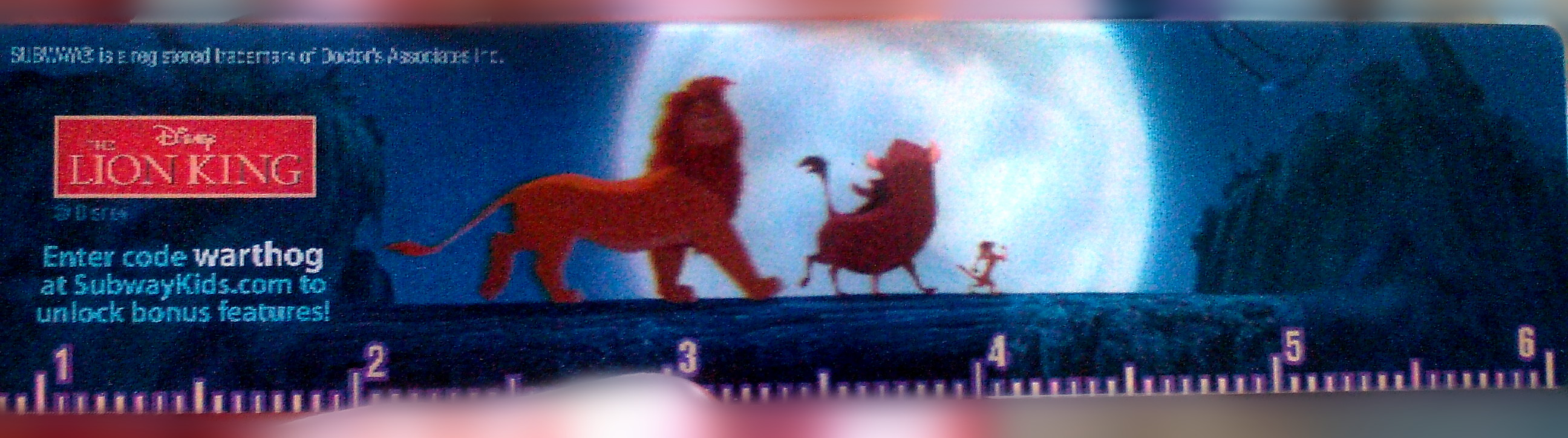Guess what. I OWN THE MOVIE NOW ^_^. It's only VHS but that makes me happy because it is the origional version (without the morning report song) the same as the one I watched as a kid. I also bought a Subway Lion King Promotion Bag (the red bag) and a Subway Lion King Promotion Ruler and coupon. So, SUPER ULTRA HAPPY FACE for my four new editions to my LK collection ^_^. Hope you like! :P