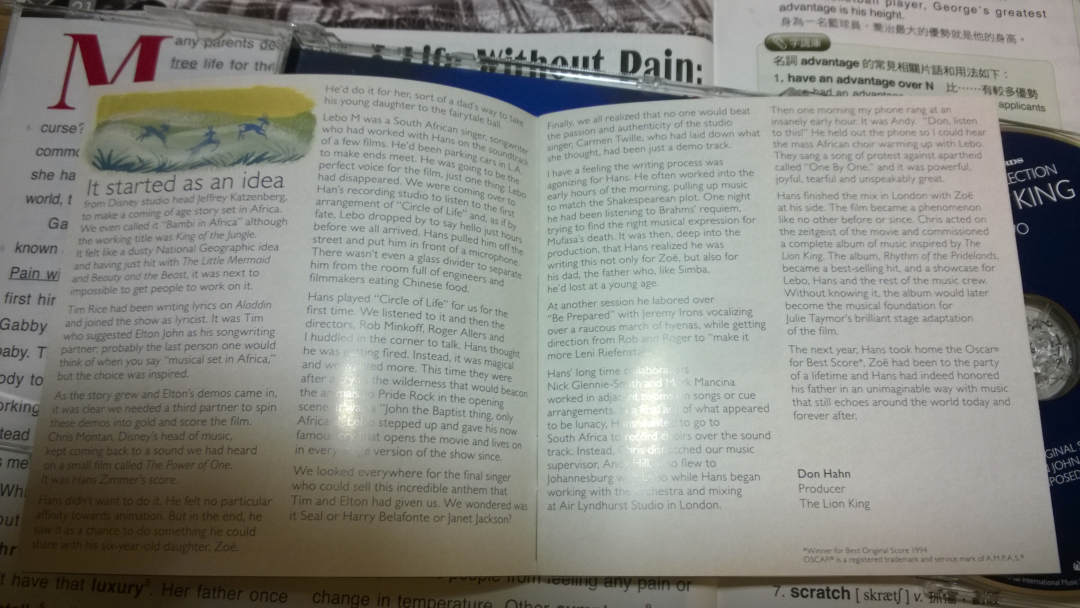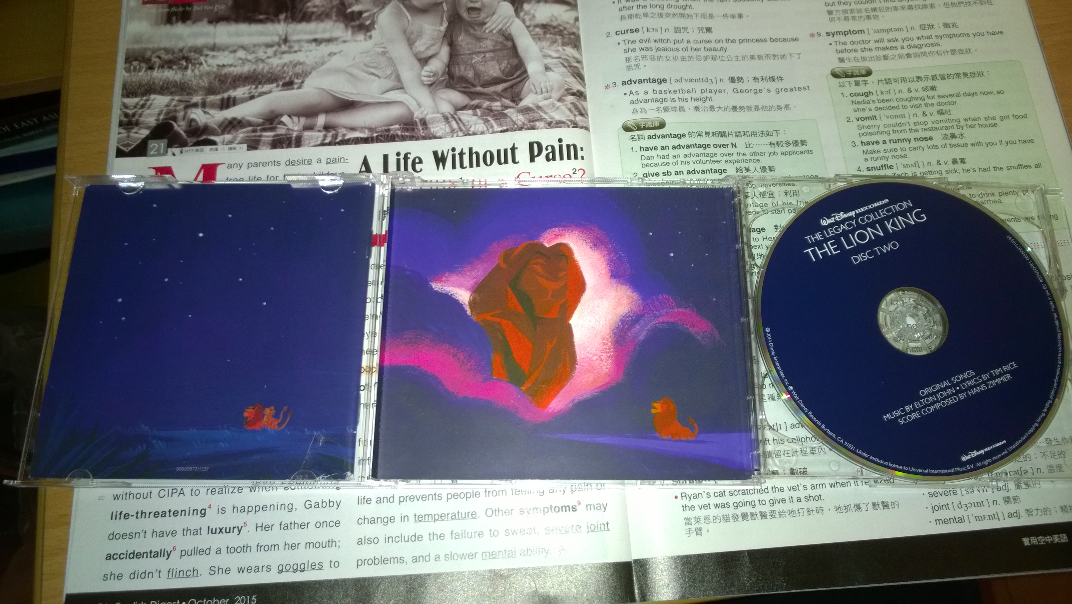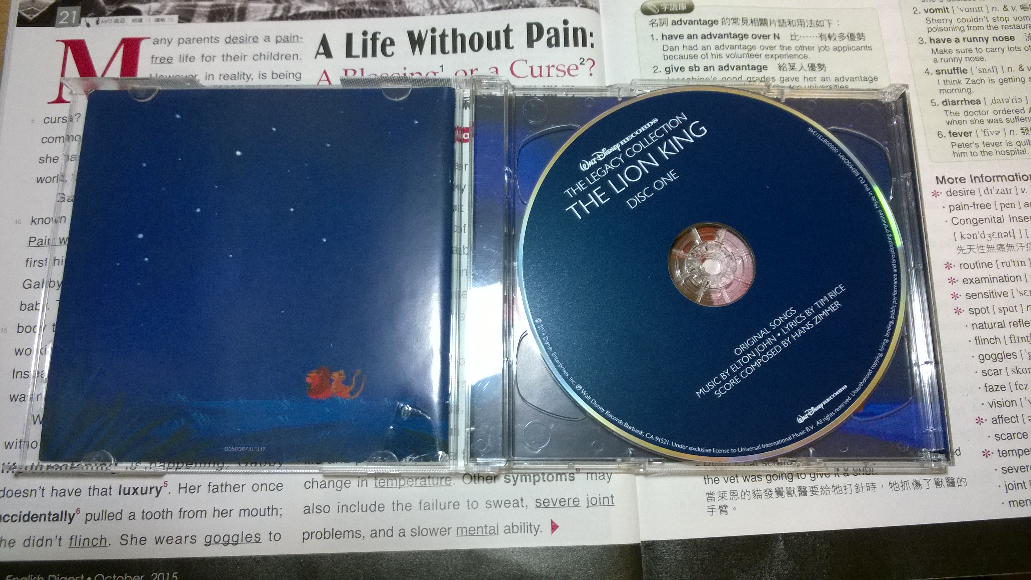 The plastic case may seem cheapy than book case in first sight, but I think it protects the CDs more. And yes, it's English. Even the CDs are made in Germany by Universal. The quality is nice. But I have a question: the songs in this album are much louder than TLK OST and Return To Pride Rock. Do you guys have the same phenomenon ?