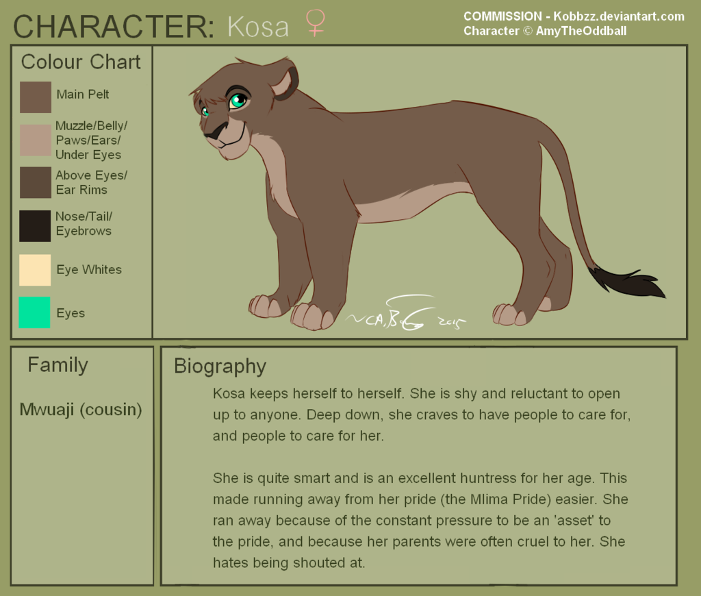Personality: Kosa is very shy; she is withdrawn and keeps herself to herself. The harsh environment she grew up in contributes to this. Her parents were quite cruel to her, and she hates being shouted at or coming into conflict with others. She has clear trust issues, but once some lion has earned her loyalty she becomes a friend for life. She is quite smart and an excellent huntress for her age.