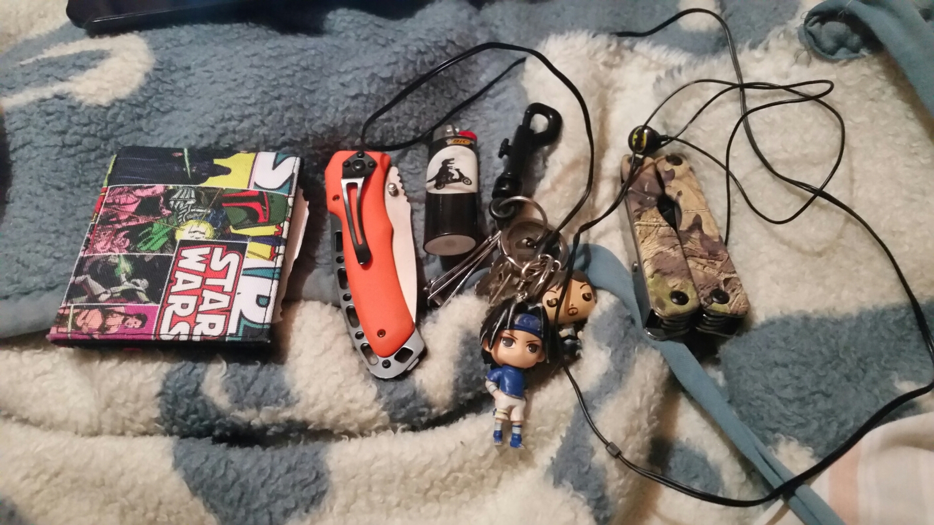 First we have my wallet. Look at it, being all Star Wars-y. Then there's my pocket knife, because of course those are useful. Next to it, a lighter, I don't smoke, but a lighter could also come in handy sometimes (though I really only use it at home for lighting incense). Then there's my keys and nail clippers, with, yes, Sasuke and Daryl keychains. I'm a dork. There's also my multitool, which has pliers, a bottle opener, and other random potentially useful stuff. And around it all is a pair of cheap headphones cos my fancy ones broke and I can't afford to replace them.