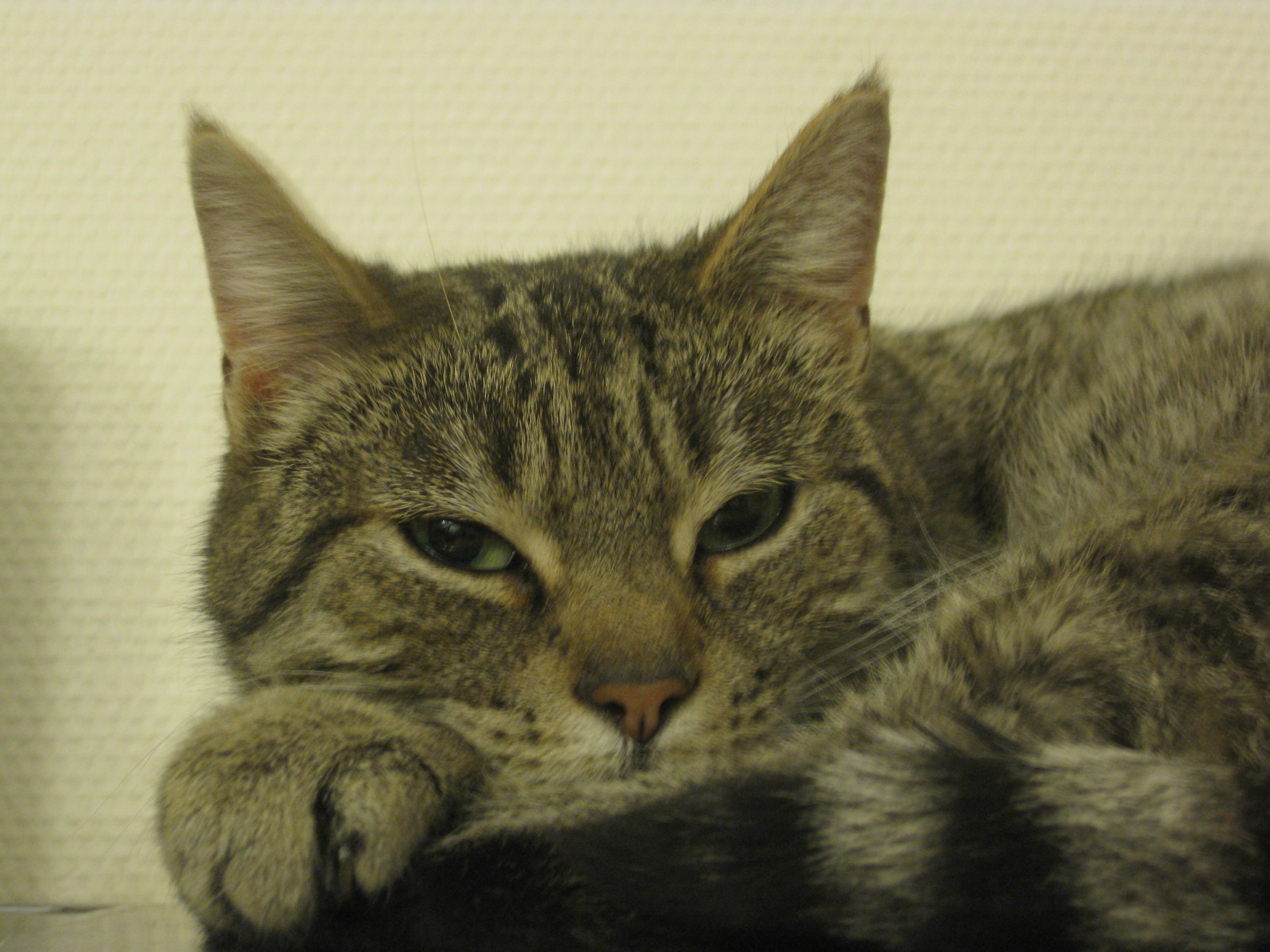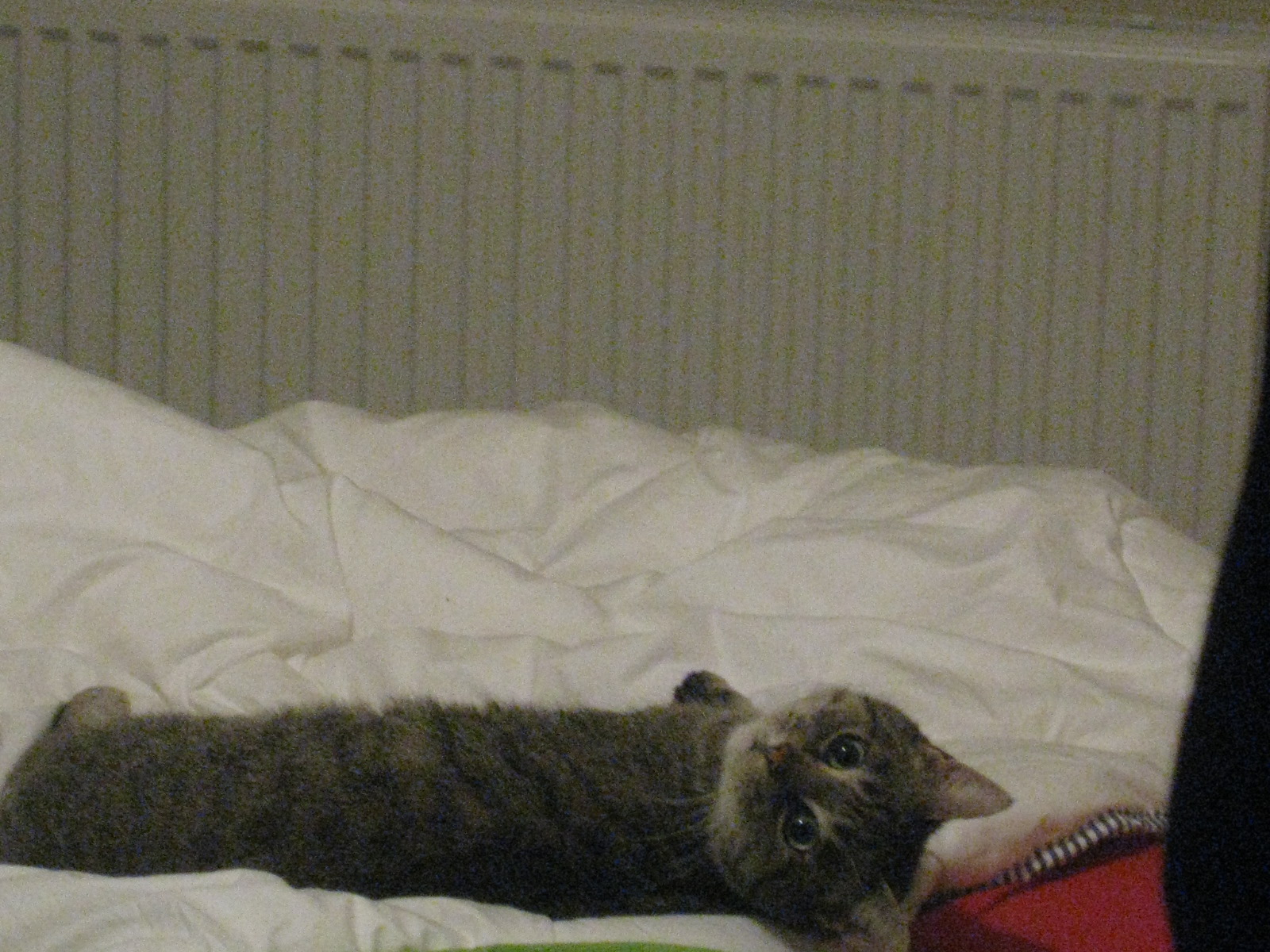 This was the first picture I took from Fleur, when she felt comfortable enough to accept my pressence, back then, only just up till 2 metres distance away from her. Yesterday she went over to me, whilst I sat on the couch. And Gues what? She nearly laid herself down onto my lap! Quite quick for a traumatized cat, in a rather new environment I'd say!