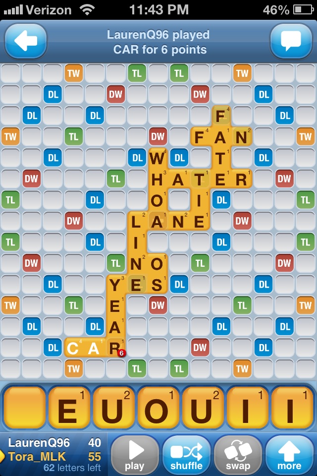 Trying to annoy Tim at his own game, yet he wines when I gain 7 points for one word I spelled and he was already winning. :nehneh: :P
