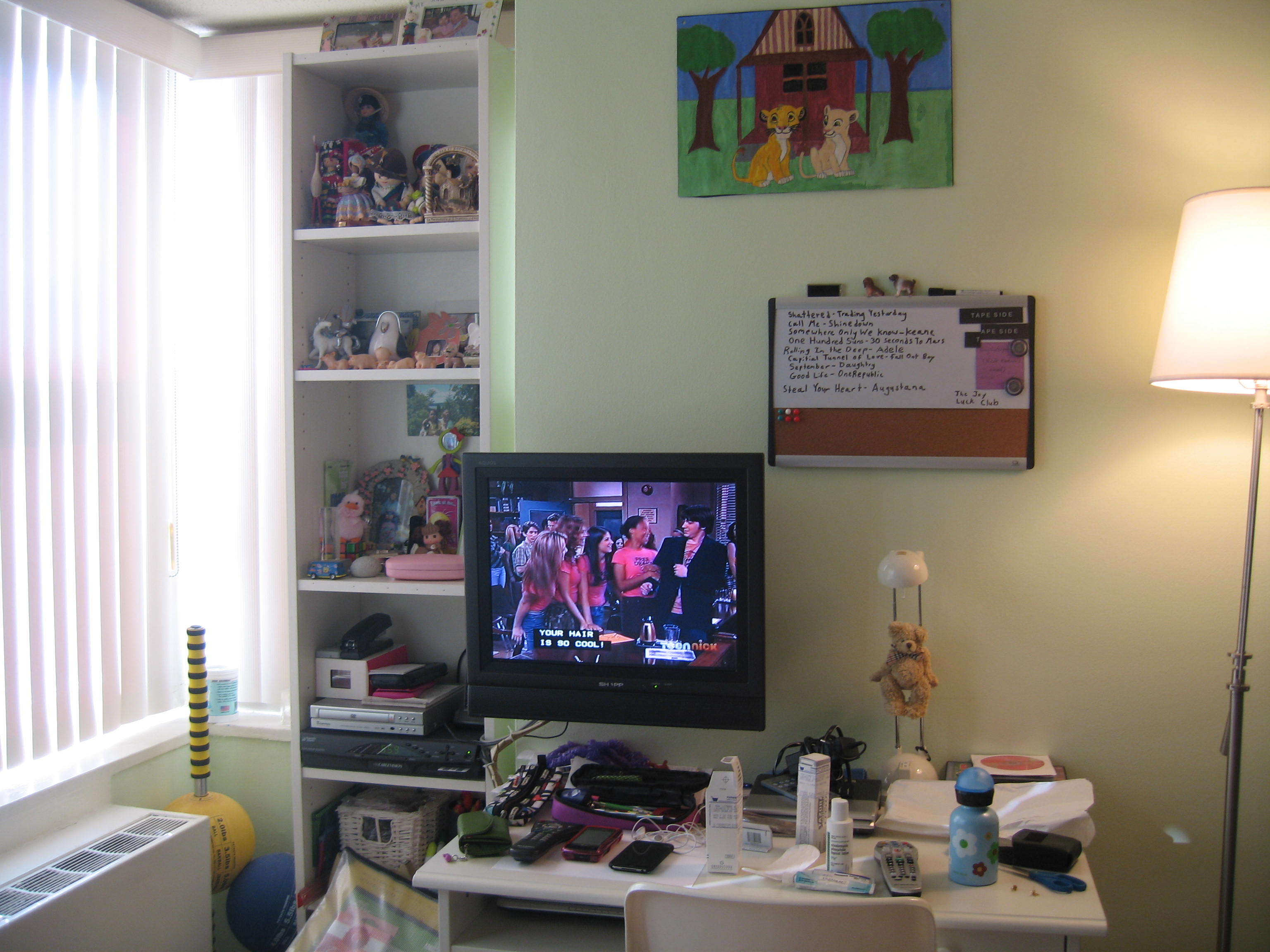 But now it's just a pain ol' room with like 4 spongebob posters, a finding nemo poster, an avatar poster, a POTC: dead mans chest poster, and a green day poster. I have a dresser with a TV, VHS, PS2 (currently being borrowed, while I borrow their DS xD), a lamp, and a phone. In the closet I have stacks of VHS tapes, and books, and quite a few Mangas, since I'm working on finishing off my dragonball manga collection.