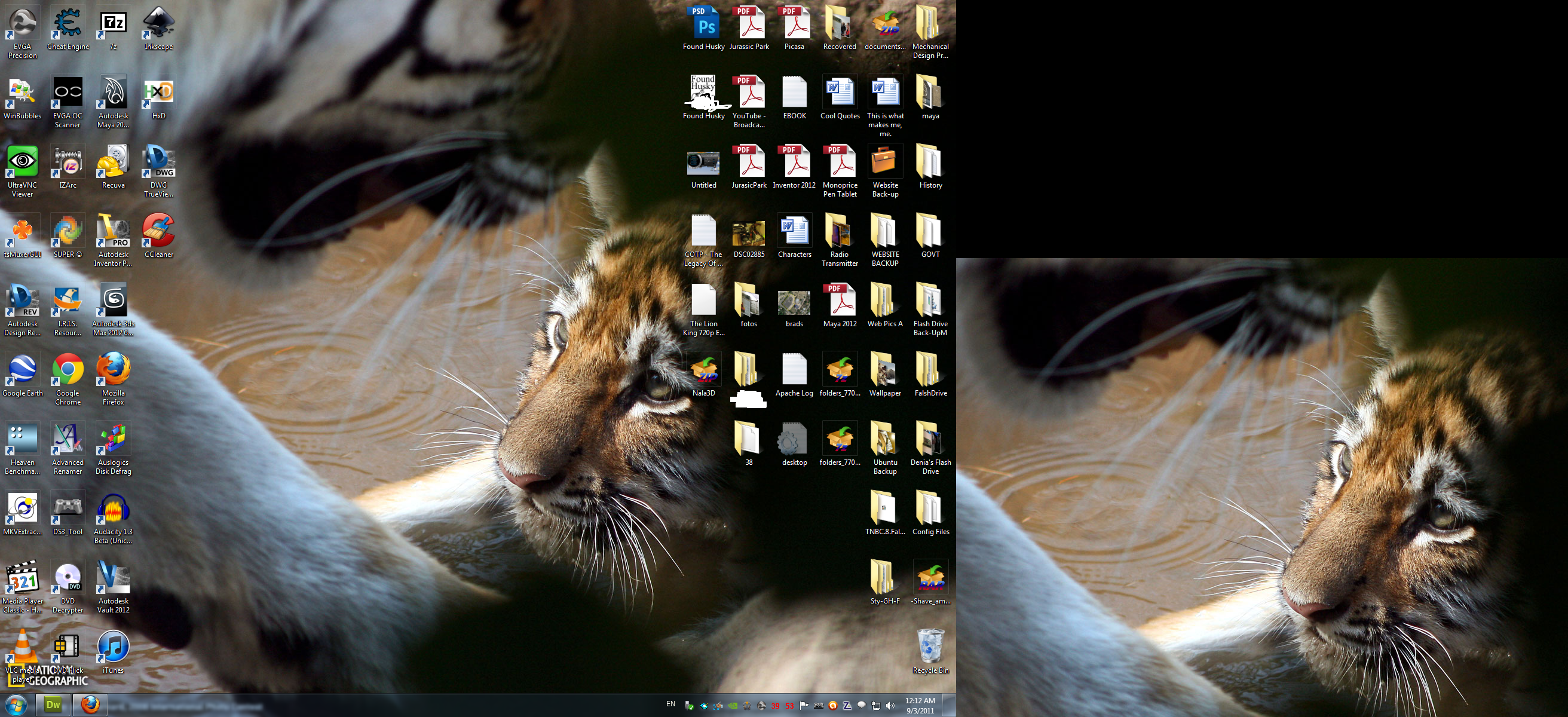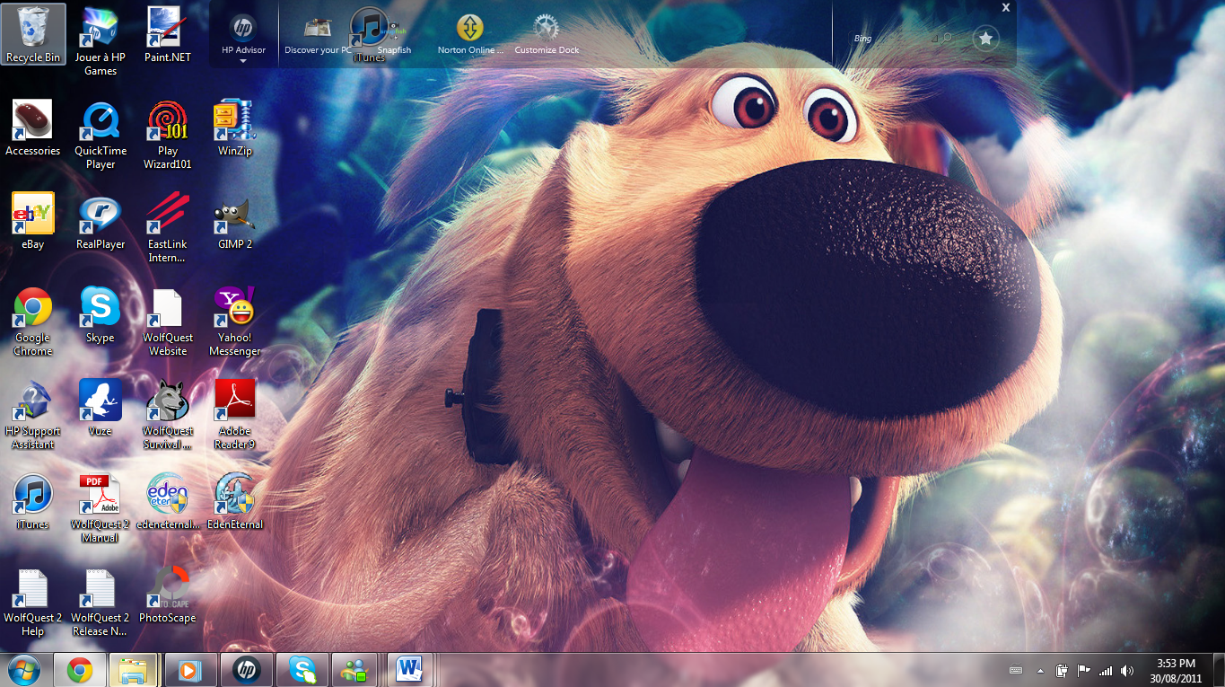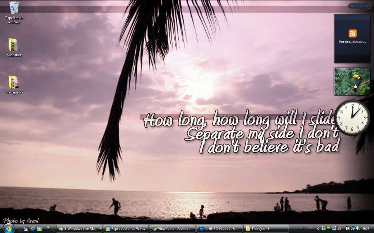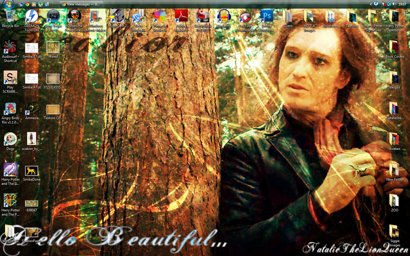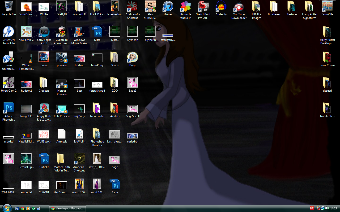 Here's mine. :) The background changes and I have lots of nice backgrounds. The desktop used to be clean, but yeah... :huh8: