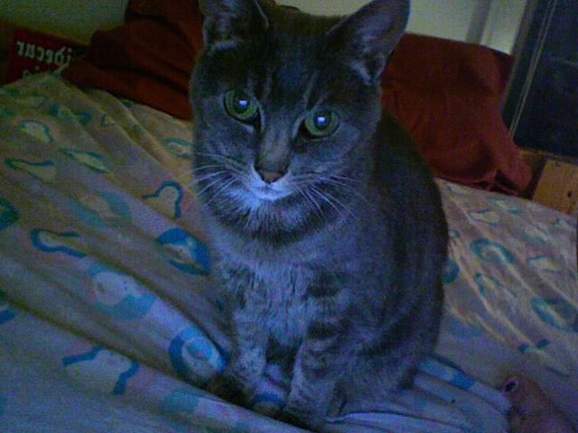 She is black, with white and orange stripes. She's around 3 or 4 years old I believe. My cousin found her under a railway track, and took care of her, until she had to move away. Then we were left to take care of her. She now lives with my sister, but I still visit her, when I see my sister.