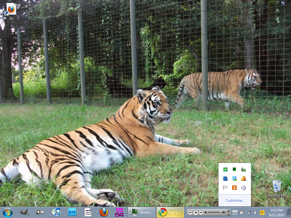 The desktop icon on the upper-left is a shortcut to the next episode of 24 I'm going to watch on Hulu. In the system tray from left-to-right there's uTorrent, Task Manager, USB crap, Intel Graphics Driver, TeamViewer (for accessing my PC remotely), Microsoft Security Essentials bugging me about a vulnerability *slinks off to take care of that*, notifications and stuff, Java, an ISO mounter, battery status, wifi status, sound, and the weather. It's yellow because there's a heat advisory Dx