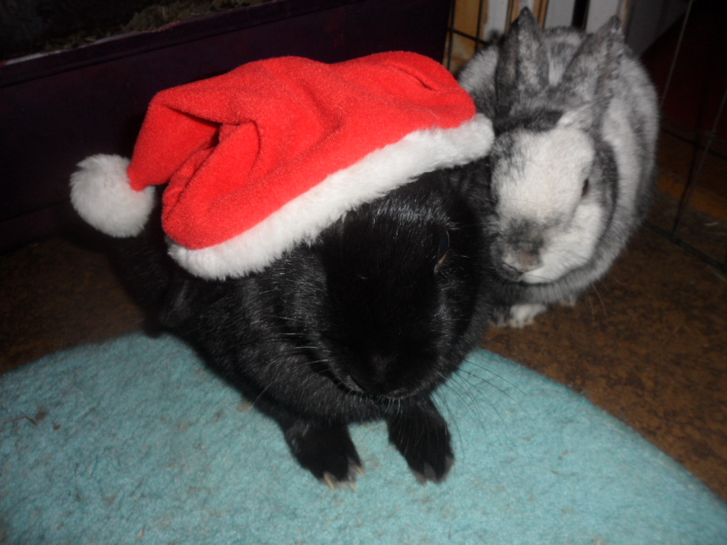 My two rabbits Boris and Bella <3 Bella is the black one with the Santa cap (she was not amused! xD) and Boris is the little grey and white one. They both have amazing personalities and are so friendly! Boris is turning 5 this Spring and has grown out of his old habits of chewing everything in sight. Bella however is only 3 so she's still pretty naughty!