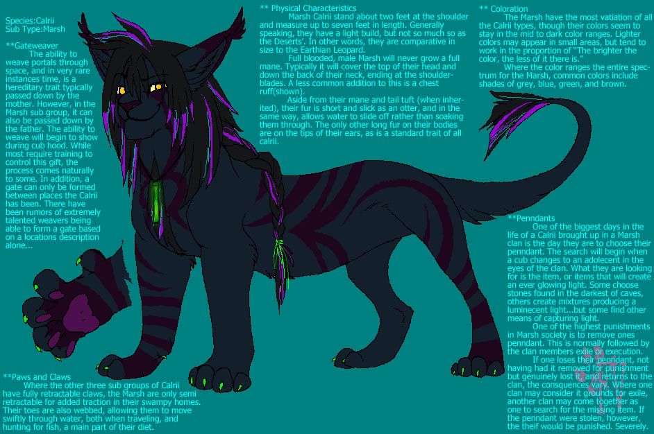 Yuuki, being a Marsh Calrii, enjoys hanging around wet, swampy lands. He's definitely not afraid to get his paws wet or drive right into the water with the alligators or snakes. His favorite past time is scouring the swampy lands for treasure. Jewels, bones, metal objects - all are fair game when Yuuki's on a treasure hunt! He's often seen wearing many of the objects he finds, although his absolute favorite thing to wear is a green glow stick he's found.