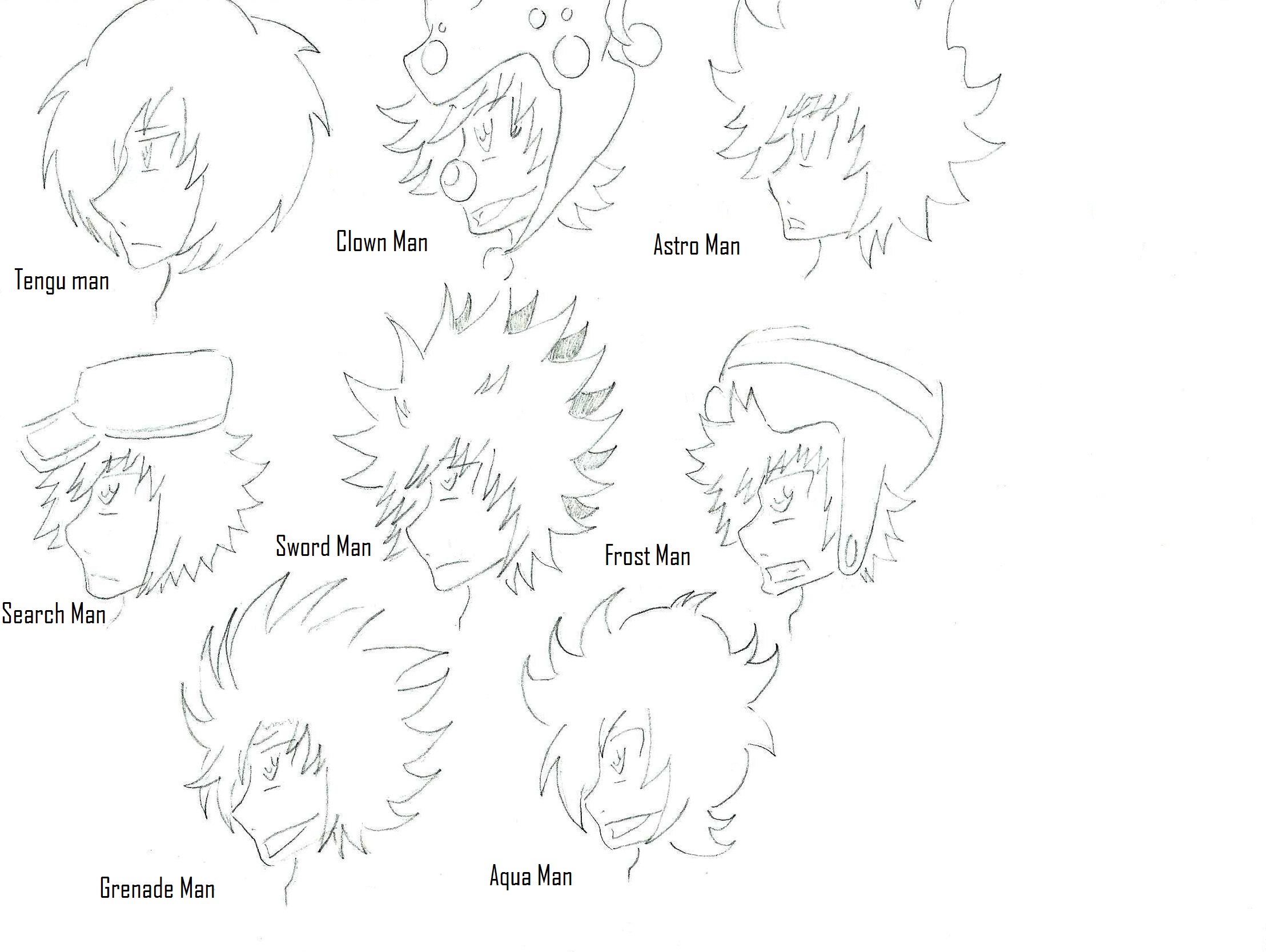 Don't ask why the sudden Mega Man pictures, but there's a picture of the Mega Man 8 stage bosses as humans. There names are tagged next to them, first is Tengu, then Clown, then Astro, then Search, then Sword, then Frost, then Grenade and lastly Aqua.