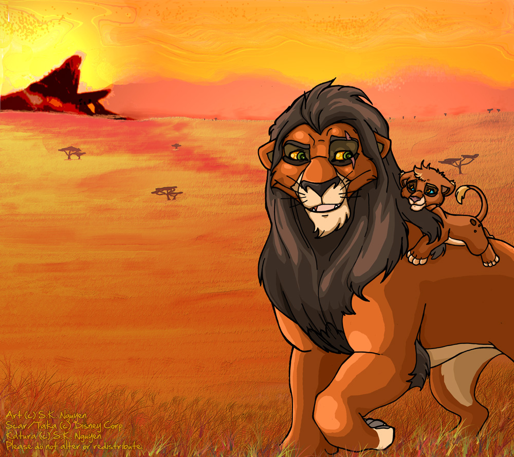 First one is Scar is an AU universe where he is king and basically takes on Mufasa's persona. The cub on his back is my OC Katura. Second picture is of a short comic idea I had about Scar challenging Mufasa's right to the throne as adolescents and then defeating him in the ensuing ceremonial battle, much to his father's chagrin. Got the idea from the part of the movie where Mufasa asks Scar if he's challenging him when Scar says that Mufasa shouldn't turn his back on him. I was like- O_o Hey wait, sub-plot AWESOMEness. The dialogue goes something like this: