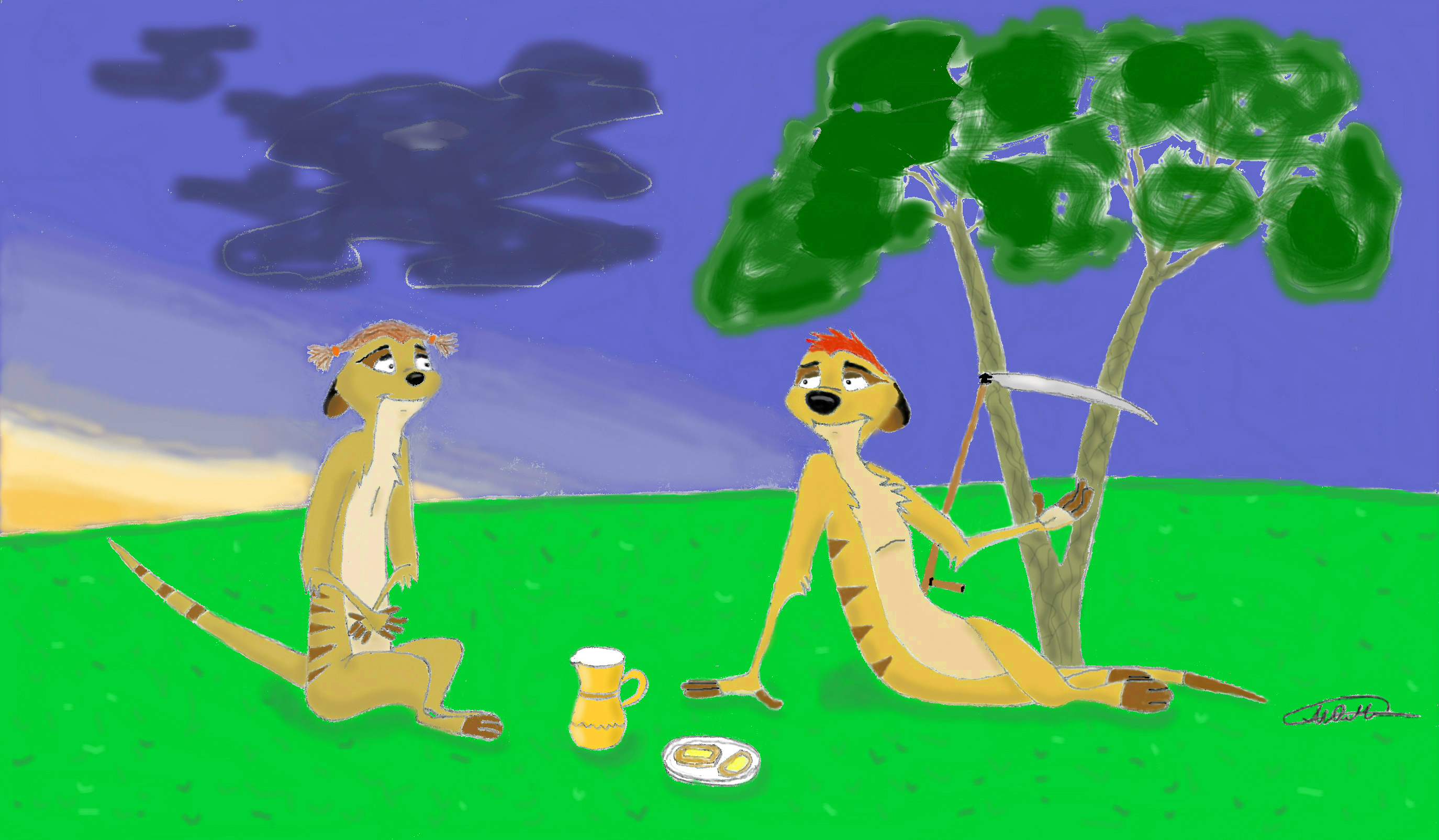 My another drawing about Timon and character that is invented by me - Tamara (or as now Timon call her - Toma) is from the same colony as Timon. One evening she saw him mowing grass with scythe and decided to help the tired Timon brought him some milk and a little bit snack. Since then, they are often seen together. Obviously they have a lot in common. Image