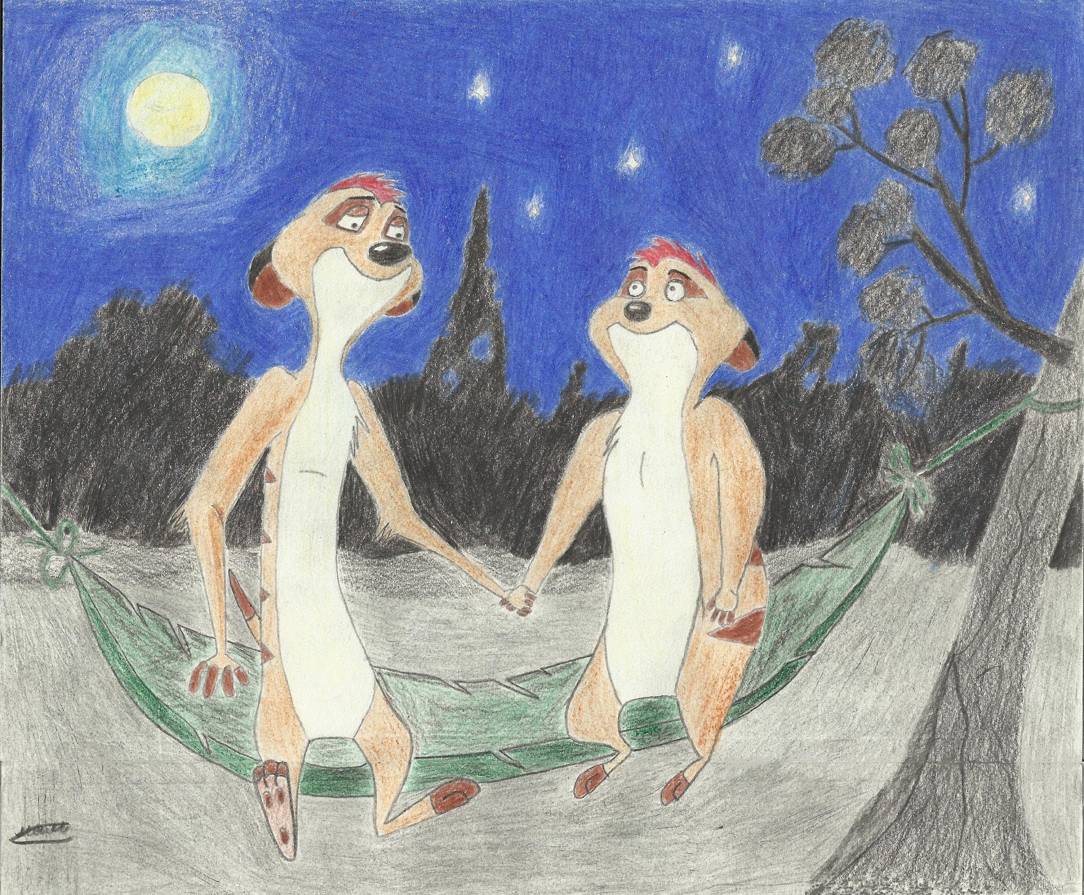 My another drawing about Timon and character that is invented by me - Tamara (or as now Timon call her - Toma) is from the same colony as Timon. One evening she saw him mowing grass with scythe and decided to help the tired Timon brought him some milk and a little bit snack. Since then, they are often seen together. Obviously they have a lot in common. Image