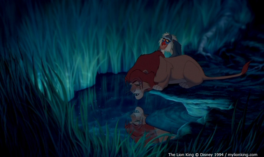 Here's another. Its hard to get a screenshot of it, but after Simba sees his reflection in the water, he looks up to see Mufasa in the clouds and the pool is gone.