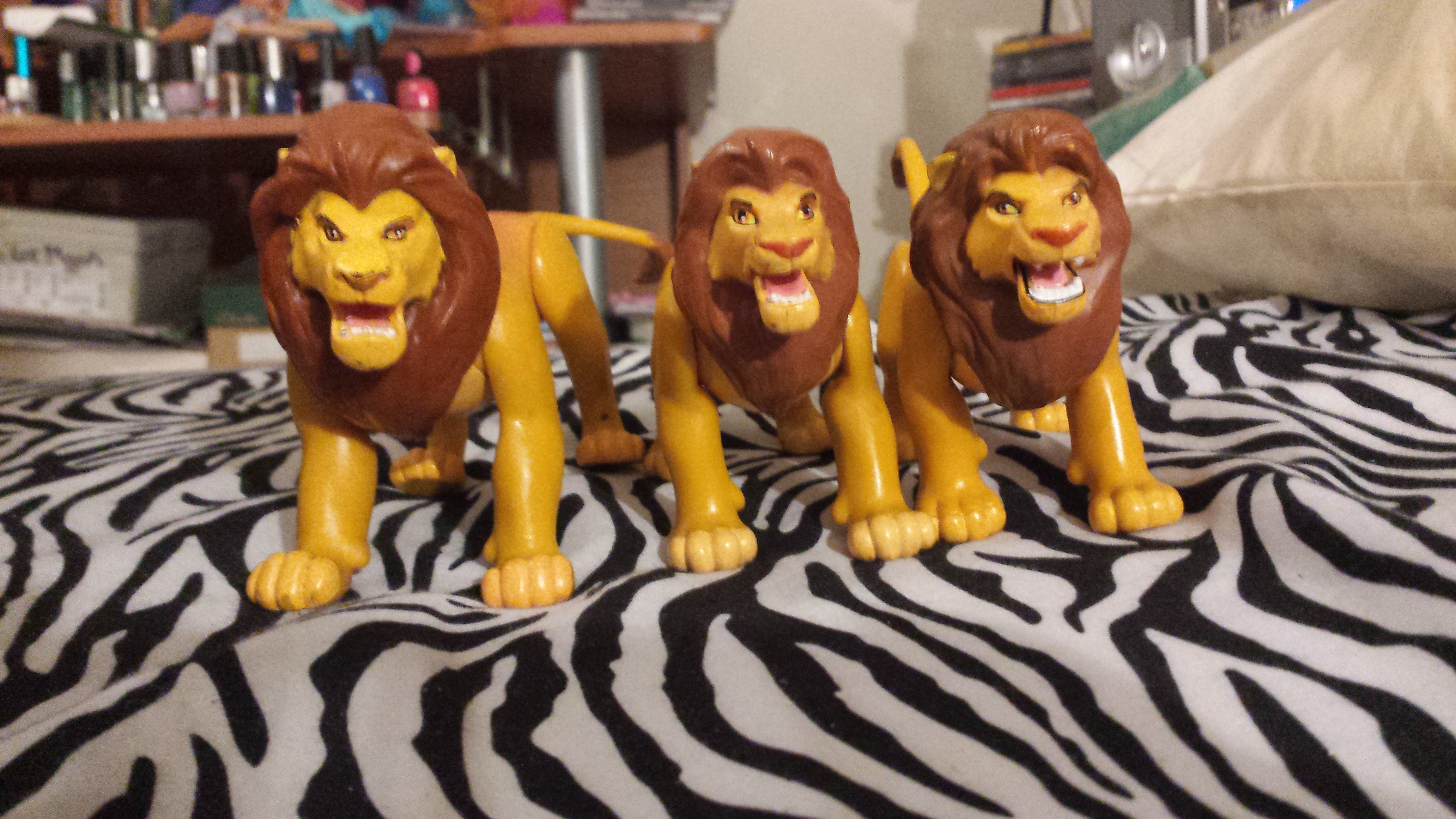 I actually have a question myself. I have gotten some figures in a couple lots and noticed some of them are the same but...different. The two adult ones are both clearly adult simba (I think) and the others are definitely young simba. The adult ones are completely but completely similar. They both do the button action fighting and the colors are the same but the facial expressions and the tail stand out as different. The young ones are exactly the same but the one I just got looks like a knock off. It's body is a different shade than the rest of him and the head and limbs are just YELLOW. Were these released at different times? Are they mistakes? I'm just curious.