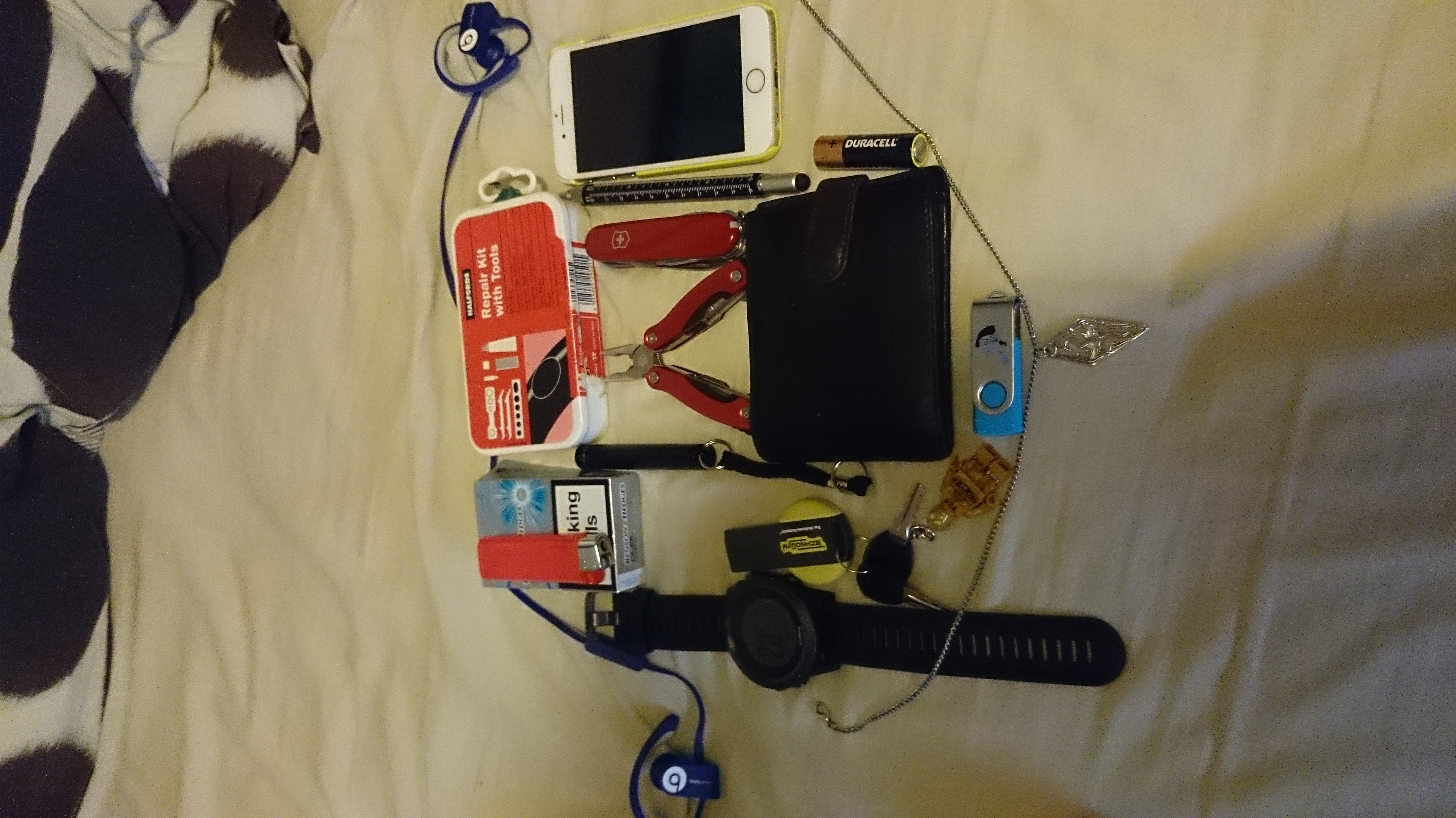 First we have my wallet. Look at it, being all Star Wars-y. Then there's my pocket knife, because of course those are useful. Next to it, a lighter, I don't smoke, but a lighter could also come in handy sometimes (though I really only use it at home for lighting incense). Then there's my keys and nail clippers, with, yes, Sasuke and Daryl keychains. I'm a dork. There's also my multitool, which has pliers, a bottle opener, and other random potentially useful stuff. And around it all is a pair of cheap headphones cos my fancy ones broke and I can't afford to replace them.