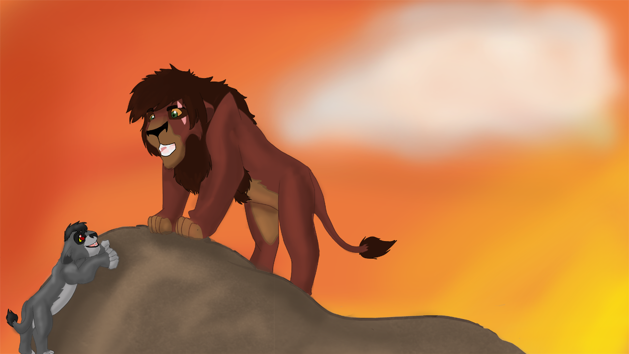 I drew an older Kovu talking to a grey Cub (possible young Kivuli perhaps!). I wanted to try drawing a background properly and drawing some stuff WITHOUT a reference. i think it came out alright.