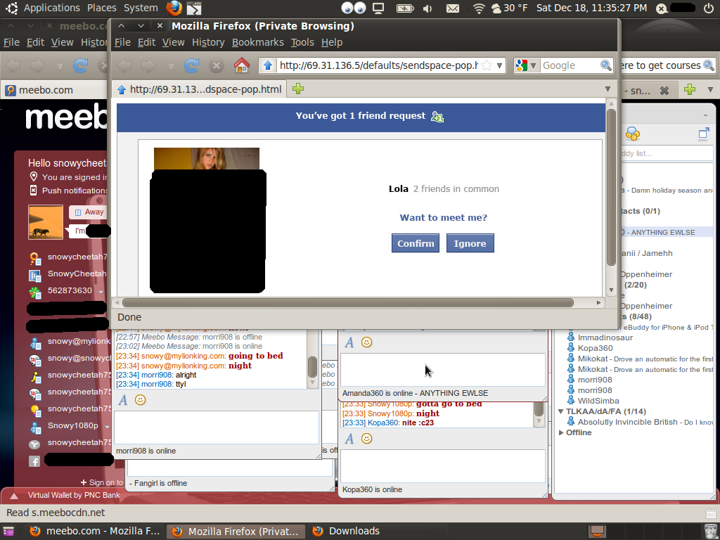 Just something to watch out for! A friend gave me a file via sendspace and it gave me the pop-up you see here. It's a very convincing fake friend invite made to look as if it were a Facebook page. No idea where it would take me if I clicked it, and I don't care to find out what kind of nasty or malicious place it is. Just thought I'd let you all know to look closely when a pop-up or other webpage that you didn't specifically go to looks like Facebook, MSN or anything else. They're very convincing!