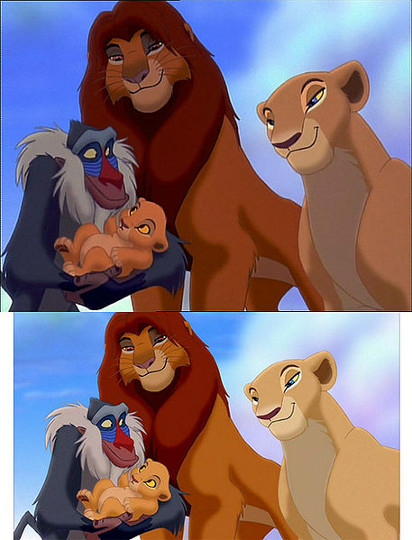 See in the top image, Simba is orange and his mane is like brownish red and Nala is...I don't even know? But they fixed it in the Special Edition DVD to make they look more like the Simba and Nala in that screengrab.